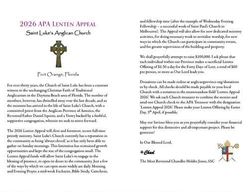 For funds going to the APA (e.g., Lenten Appeal, Dalit Children, APA General Fund), please make checks payable to the Anglican Province of America and indicate the fund to which you would like to donate.